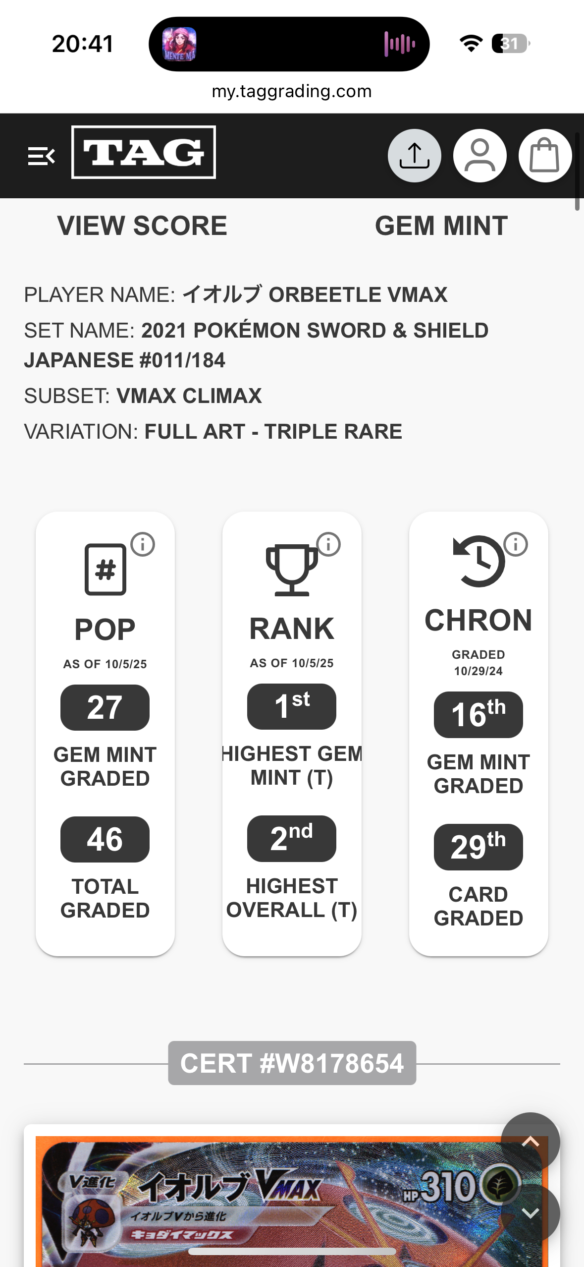 TAG 10 - Orbeetle VMAX #9 - Pokémon Japanese Amazing Volt Tackle